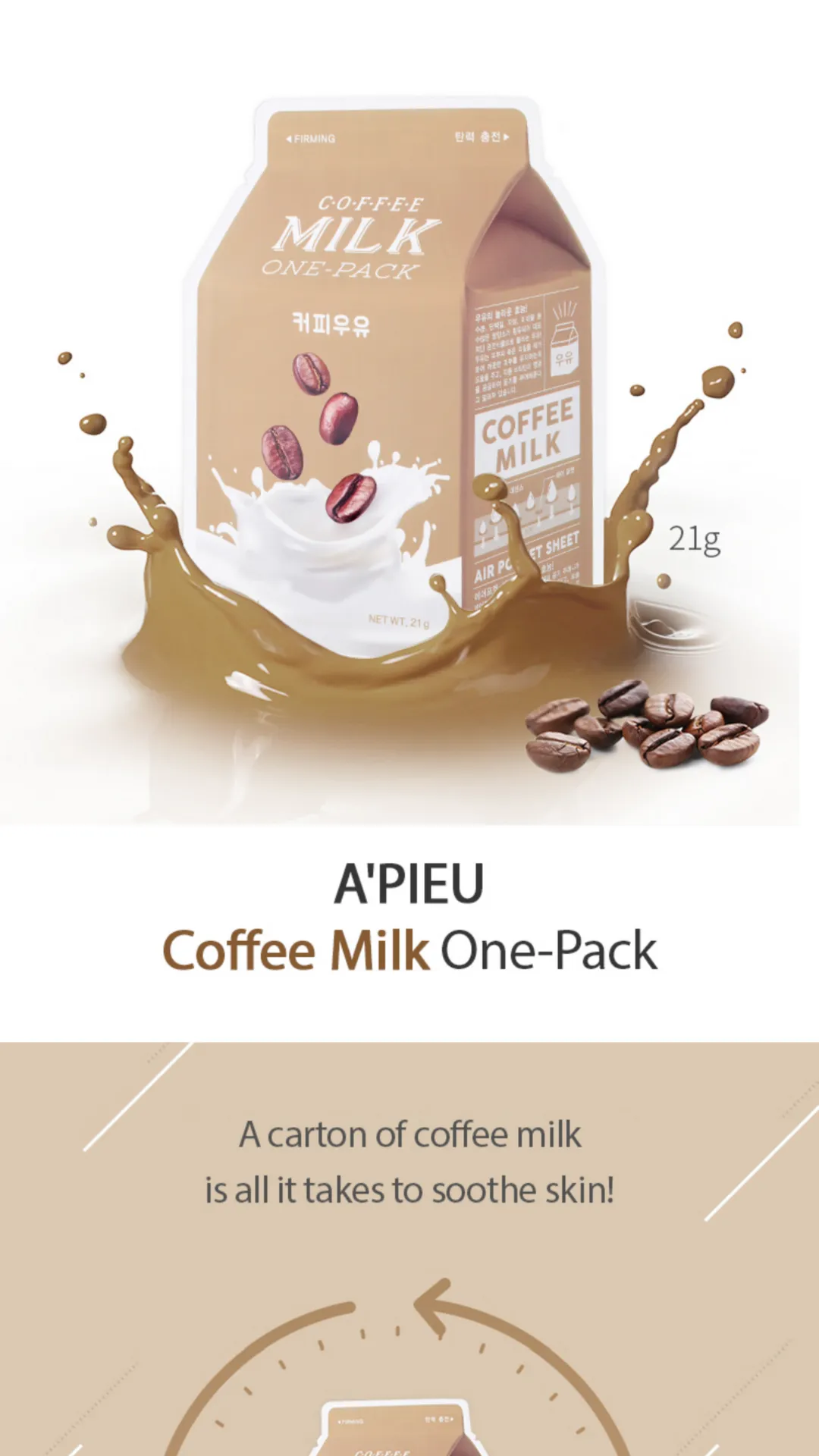 A'PIEU Coffee Milk Sheet Mask is able to wake up tired skin! This hydrating sheet mask helps improve skin elasticity while keeping your skin glowing, smooth and radiant. Coffee extract and hydrolyzed collagen helps firm the skin and provide anti-wrinkle benefits, while milk extract and hyaluronic acid deeply hydrates.