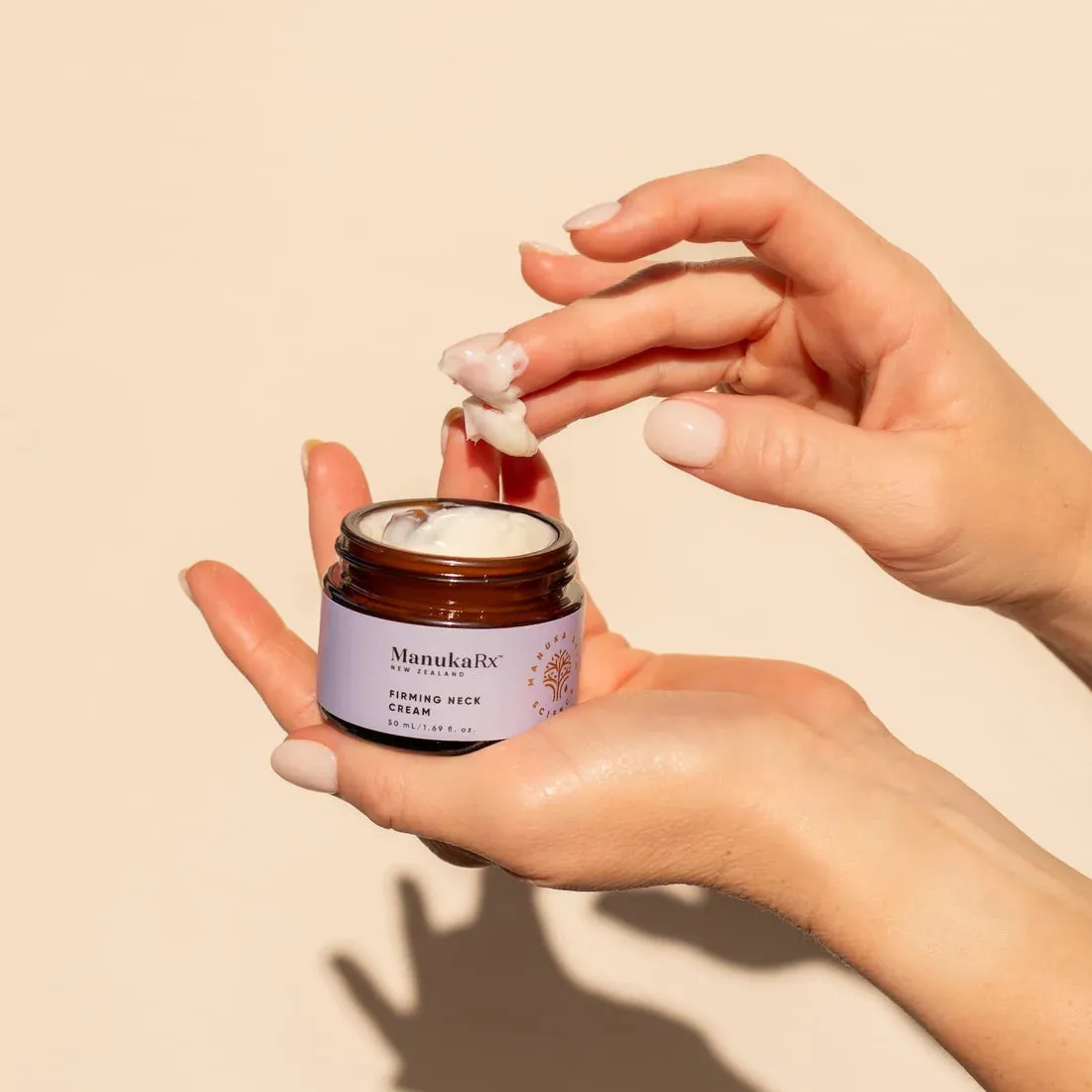 Combat visible neck aging with our Firming Neck Cream. This innovative neck cream is specially designed to tackle early and advanced visible signs of aging on the neck. Infused with potent ingredients that aid in targeting wrinkles and sagging, Mānuka Honey and Oil work together, helping nourish and stimulate collagen production. Hyaluronic Acid and Glycerin support by providing deep hydration. With consistent use, this cream helps your décolletage become firmer and smoother, resulting in a more youthful and tightened appearance.