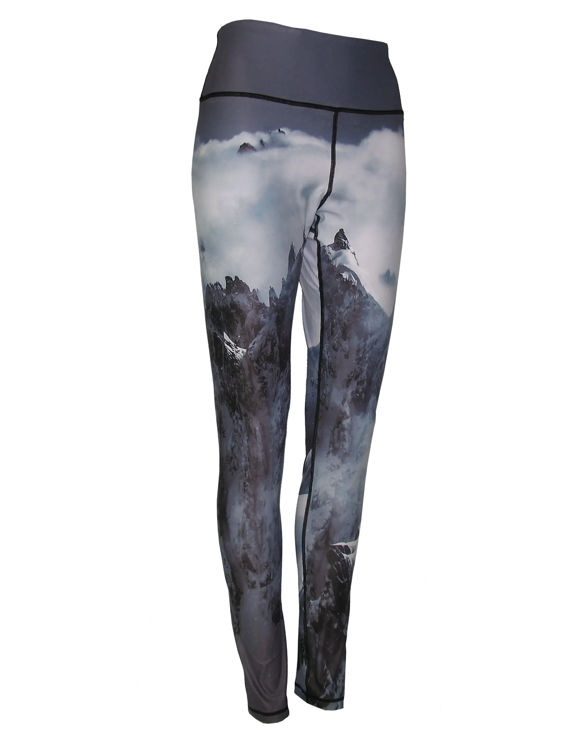 An incredible mountain landscape image on a performance yoga-style legging.  Jagged Edge shows some extreme territory on the Midi Ridge near Mount Blanc. We make the best women's outdoor skiing hiking and climbing clothing available.  Wear as wader liners, long underwear, workout leggings, or for a night on the town.  Our outdoor apparel works well as hiking clothes on the trail or as a base layer for active sports.  Moisture wicking apparel with great sun protection.