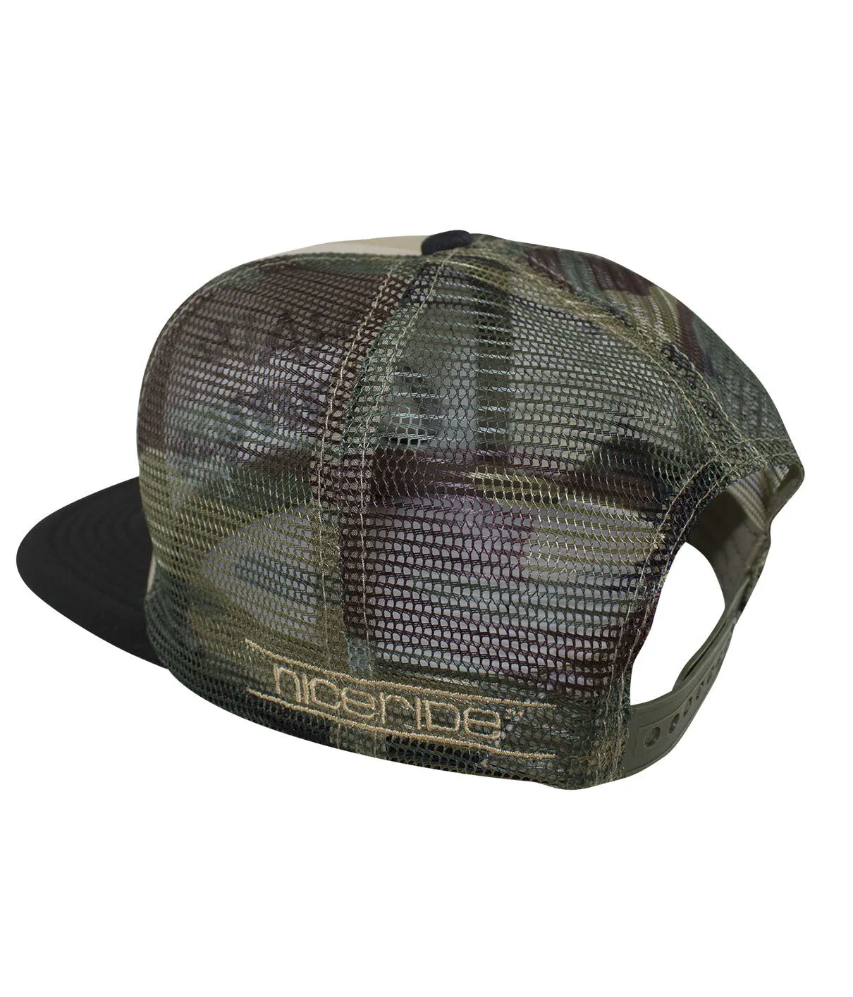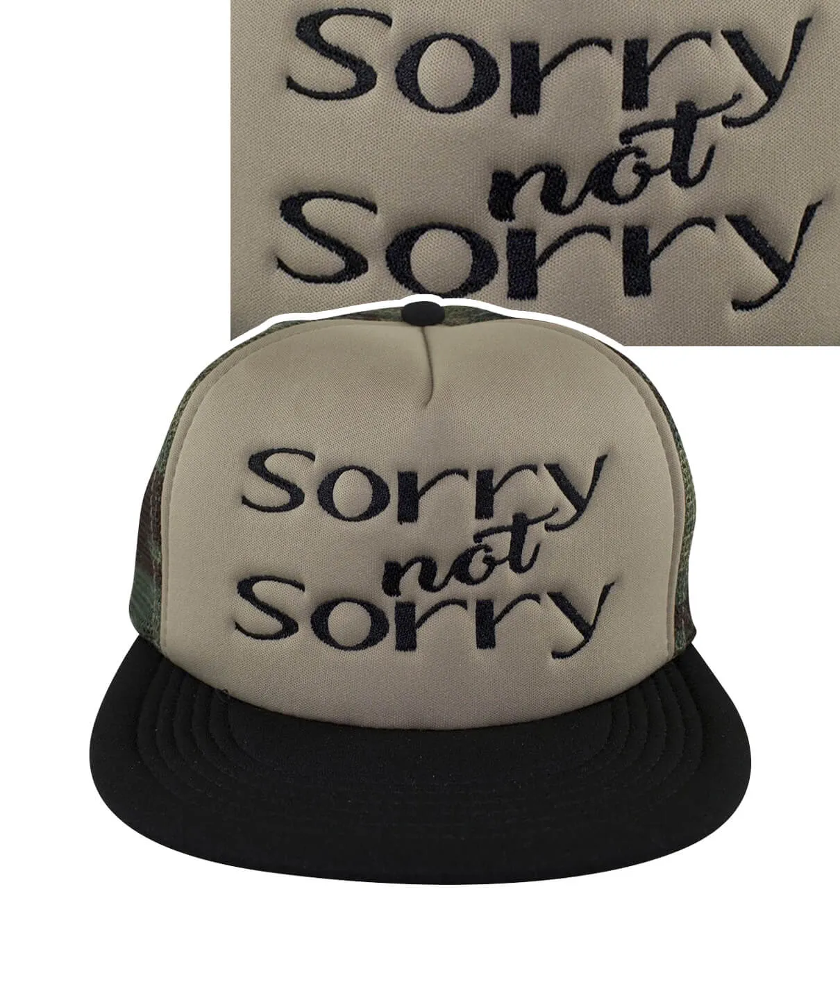 Camo Foam Trucker Hat with "Sorry not Sorry" embroidered on the front panel and NICERIDE embroidered on the left side.