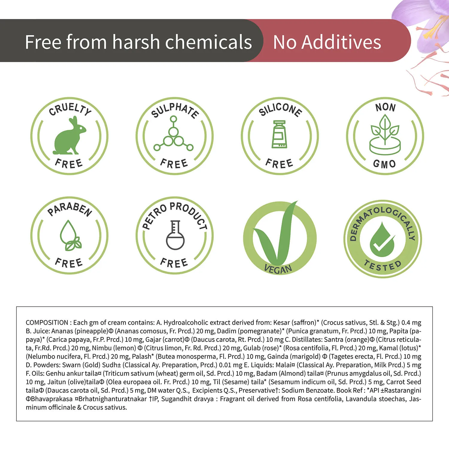 Uncover the enchanting essence of Ayouthveda Sparkling gold day cream. This delicately crafted elixir, as smooth as velvet, is enriched with precious botanical oils and extracts to rejuvenate, repair, and nourish your skin. The 24k Nano Gold (Swarn bhasma), has been recognized for thousands of years in the ancient science of Ayurveda, for its beautifying, illuminating, and healing properties known as “The Key to Youth”, it elegantly merges with your skin revealing a luminous golden allure. Kashmiri saffron, enriched with the natural benefits of niacinamide (Vitamin B3), fades dark spots, diminishes blemishes, and deeply nourishes your skin. The natural SPF protection shields your skin from harmful UV rays, evading sun damage and promoting healthier-looking skin