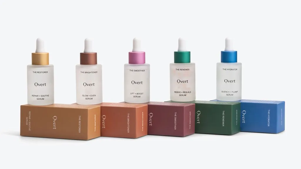 The complete range of Overt's serums now available in one kit. This limited edition set includes The Smoother, The Restorer, The Brightener, The Hydrator, and The Renewer.