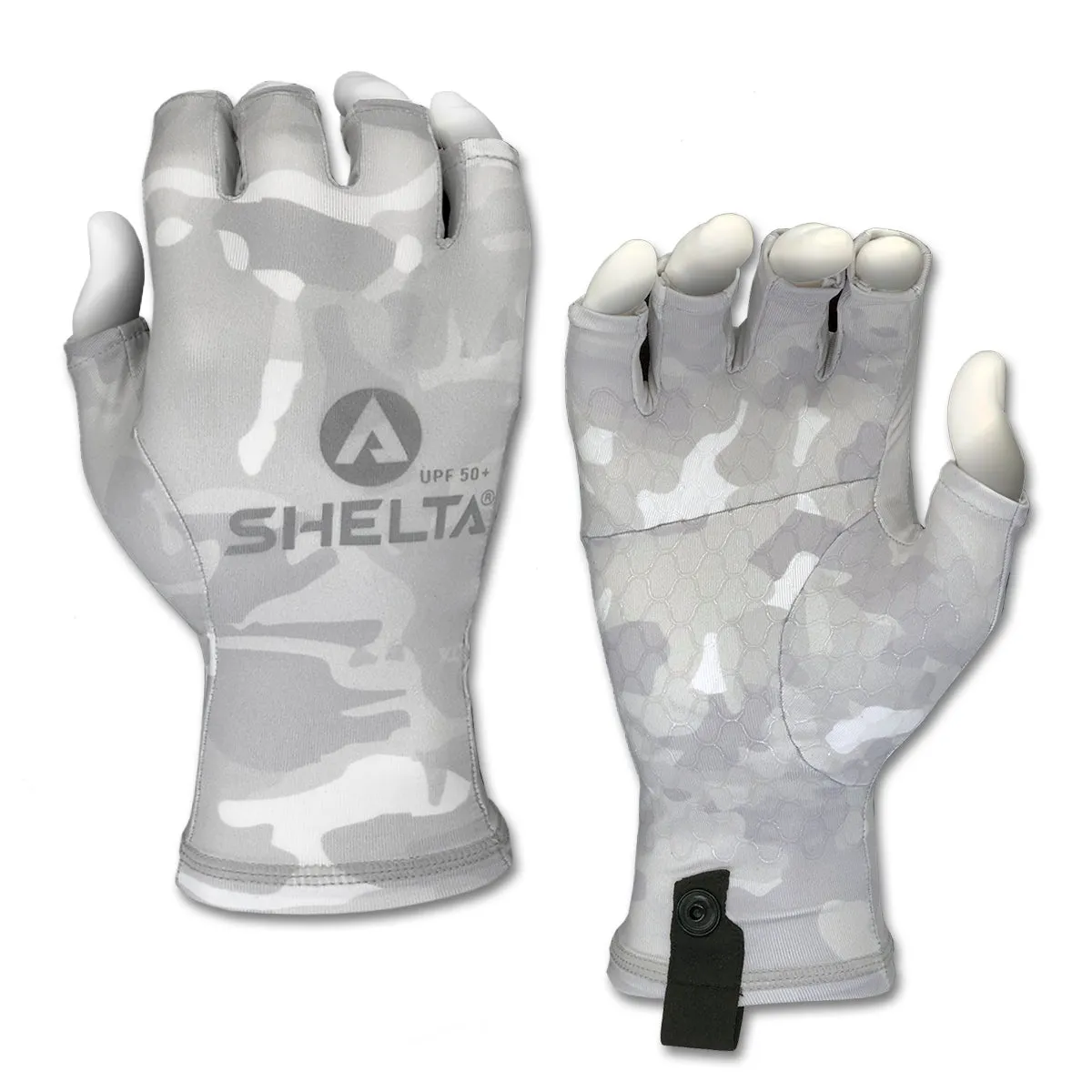Made from lightweight, UPF 50 rated moisture wicking stretch fabric, this finger less glove protects your hands from harmful UV rays. Asymmetrically sewn panels give you a comfortable fit and the silicone gel pattern on the palm provides a non-slip grip. The pull tabs have snaps to connect the pair for storage and make it easier to put on and take off. Comes in two sizes. Works as well in the water as on land. These are light weigh sun protection gloves. Not meant for work gloves.
